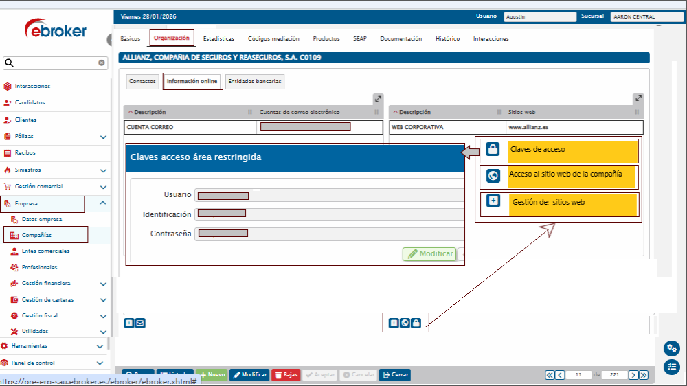 Dentro de la ficha de cada compañía, en el apartado “Información online”, encontrarás un módulo diseñado específicamente para este propósito. Desde aquí puedes: