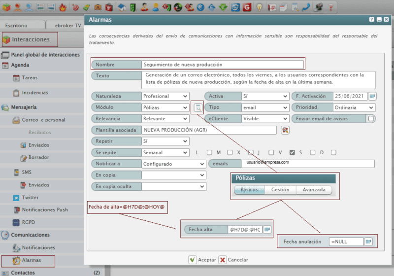 Para ello, puedes crear una alarma en el módulo de pólizas, estableciendo el medio de comunicación tipo email y asociando la plantilla correspondiente. En este caso, enviaremos una comunicación, cada viernes, con una lista de las pólizas dadas de alta en tu ebroker durante la última semana.