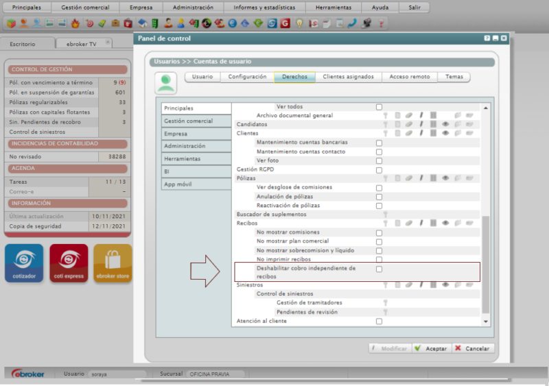 ebroker, te permite deshabilitar el botón de cobro, en la sección de gestión del módulo de recibos, para que no se pueda realizar un cobro de forma independiente. La parametrización se hace a nivel de usuario, desde el Panel de control.