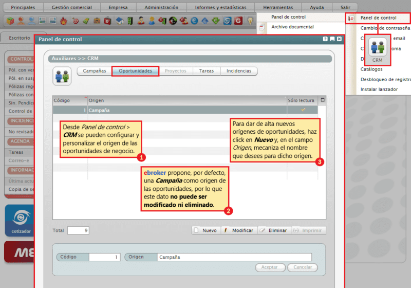 ebroker, te permite añadir nuevas opciones para escoger en el campo Origen de Oportunidades de negocio.