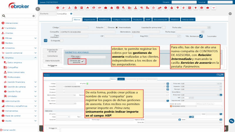 Para ello, has de dar de alta una nueva compañía de CONTRATOS DE ASESORÍA, con Relación: Intermediada y marcando la casilla Servicios de asesoría en la pestaña Parámetros. De esta forma, podrás crear pólizas asociadas a esta «compañía» para registrar los pagos de dichas gestiones de asesoría.
