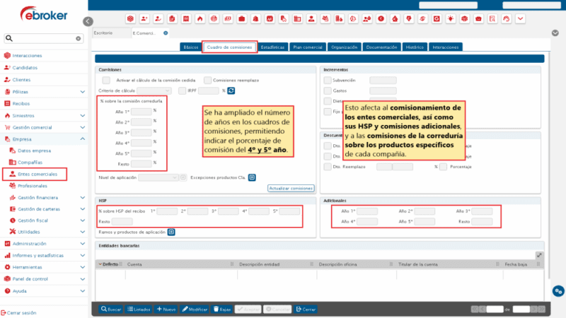 ebroker, te permite indicar la comisión del 4º y 5º año en el cuadro de comisiones de tus entes comerciales y productos específicos.