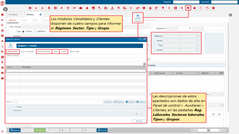 En Panel de control > Auxiliares > Clientes, dispones de las pestañas Reg. Laborales, Sectores laborales, Tipos y Grupos. En ellas, puedes crear nuevos registros a informar en los campos Régimen, Sector, Tipo y Grupo de los módulos Candidatos y Clientes.