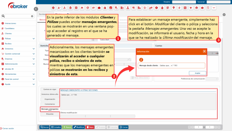ebroker, te permite anotar mensajes emergentes en tus clientes y pólizas.