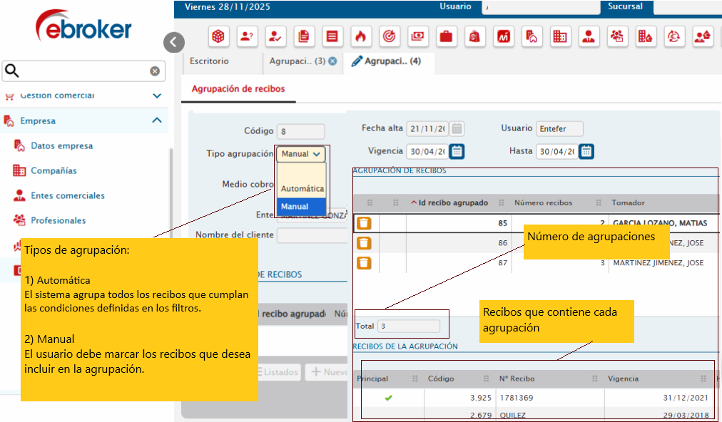 Similar a la automática, pero requiere seleccionar el cliente. Nos muestra los recibos que cumplen la condición de la búsqueda teniendo que marcar los que queremos que formen parte de la agrupación.