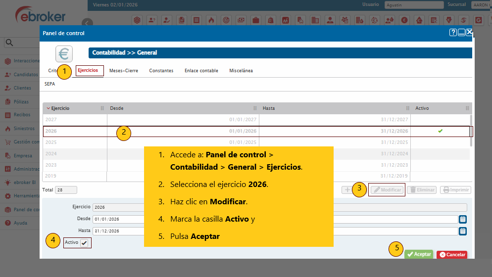 Para realizar el cambio del ejercicio contable activo en ebroker, accede al Panel de control, entra en Contabilidad, selecciona la opción General y luego Ejercicios. Una vez allí, elige el ejercicio 2026, haz clic en Modificar y marca la casilla Activo. Finalmente, guarda los cambios para que el ejercicio 2026 quede configurado como el actual.